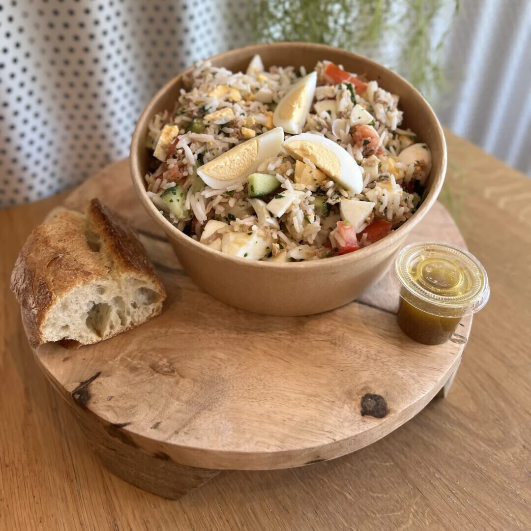 Riz, thon, œufs dur, concombre, tomate et salade.
