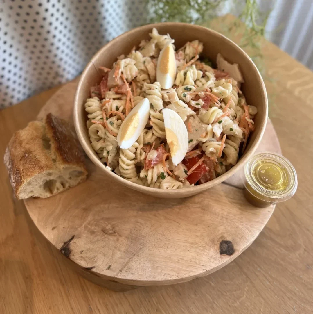 Salade pâtes sauce coleslaw et poulet, emmental