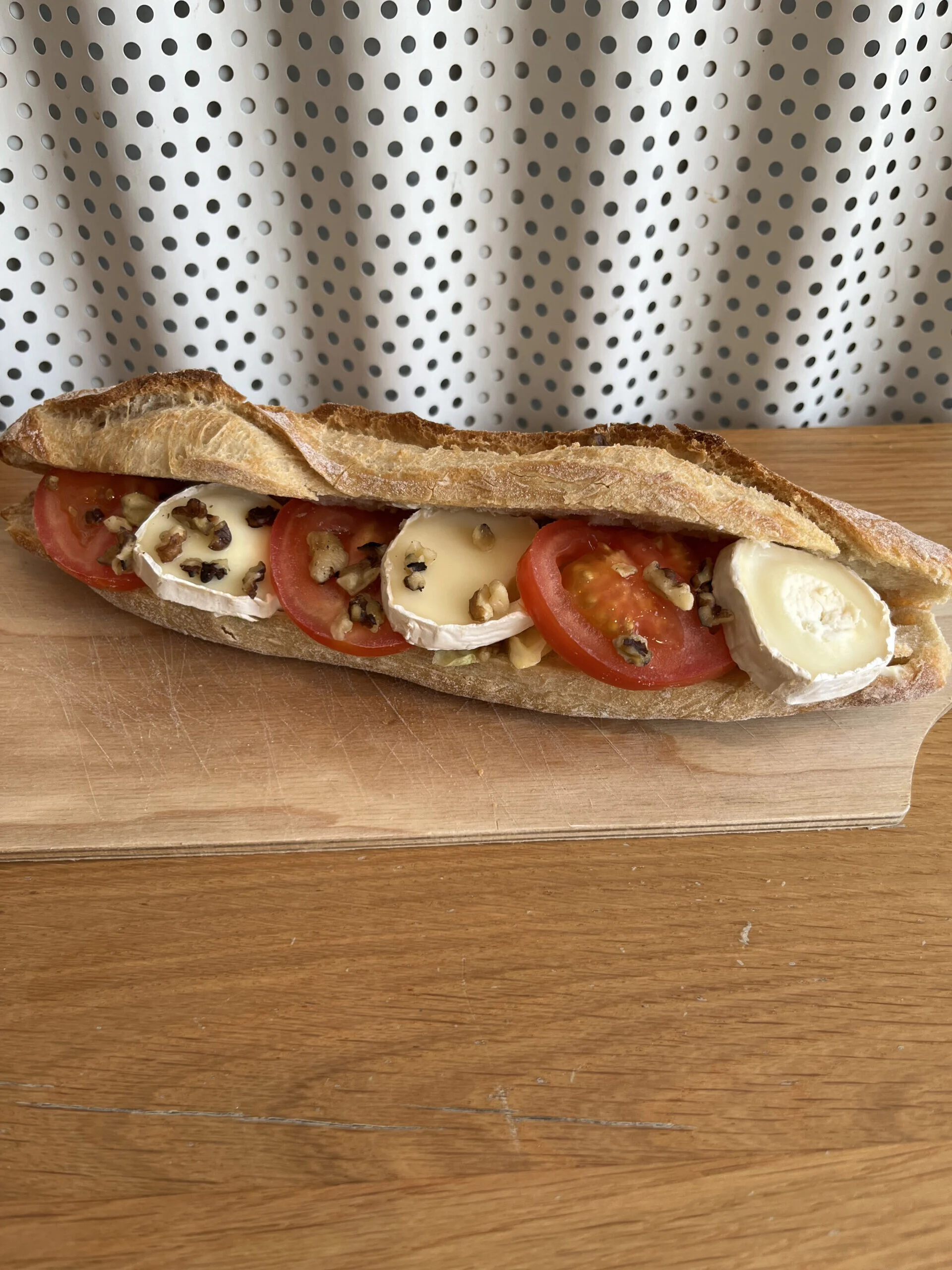 Demi baguette tradition, fromage à tartiner, chèvre, tomate, salade, noix et miel.